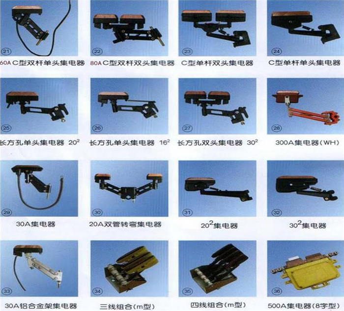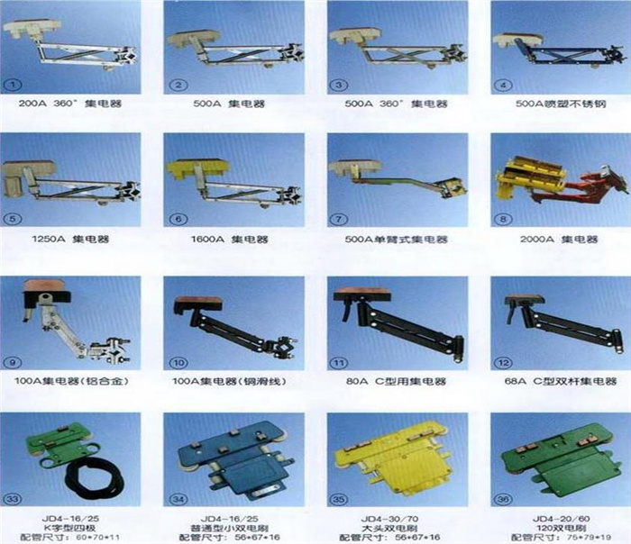 H型單極集電器、200A 360集電器、500A集電器、500A 360集電器、500A噴塑不銹鋼、1250A集電器、1600A集電器、500A單臂式集電器、2000A集電器、100A集電器、80A C型集電器、68A C型雙桿集電器、800A集電器WH、鋼體滑線雙頭集電器、鋼體滑線單頭集電器、500A集電器8字型。