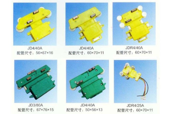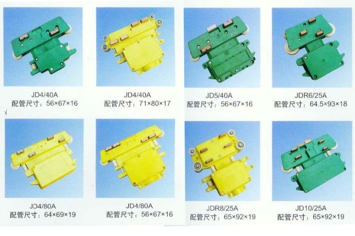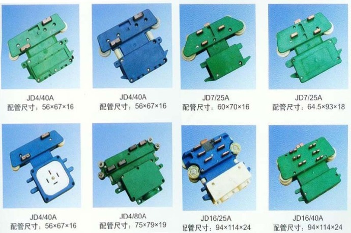JD系列多極集電器:大三極、雙電刷、普通轉(zhuǎn)彎、轉(zhuǎn)彎、大頭雙電刷、高低腳轉(zhuǎn)彎、高低腳、多極滑觸線集電器普通型四極、高低腳四極、普通型、普四極ZJG、小雙電刷、五極、四極、雙蓋雙孔、六極轉(zhuǎn)彎、小七極管、大七極管、八極轉(zhuǎn)彎、十極管、十六極、防塵雙電刷、大四極、四線插座多極滑觸線集電器。