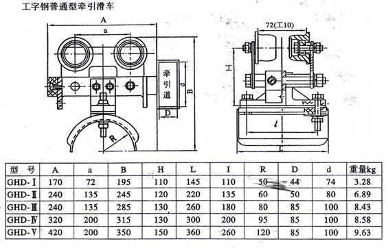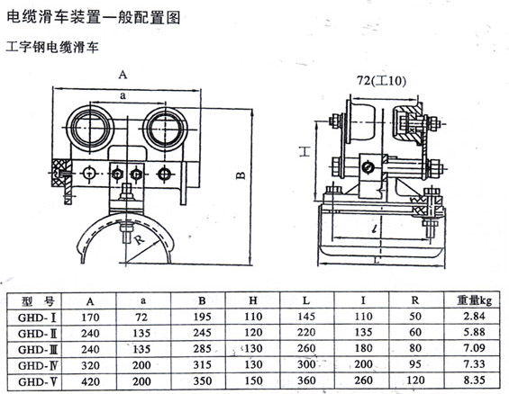 GHD-I型電纜滑車用于移動供電機械在移動中電纜的懸吊與移動,已廣泛應用于各類起重機械中。工字鋼電纜滑車該裝置具有結構堅固。移動靈活。安全可靠等優點。滑車由牽收引滑車、電纜滑車、終端滑車三部分組成,牽引滑車跟隨移動機械導纜(牽引)裝置,每個移動機械配1個,隨移動機械往返運行。中間電纜滑車將電纜懸掛在工字鋼軌道范圍內隨牽引滑車移動,兩端并裝有緩沖撞頭,滑車視移動長度不同而定數量。終端滑車固定在工字鋼導軌末端,一般每個移動機械設置1個。工字鋼電纜滑車該系列滑車分Ⅰ、Ⅱ、Ⅲ、Ⅳ、Ⅴ五種型號,如用戶采用12#、14#、16#或更大號數工字鋼,可在訂貨時注明,本廠可成套供貨。